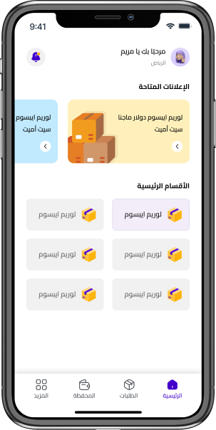 استعراض اسلايدر الاعلانات والاقسام المتاحة بالتطبيق